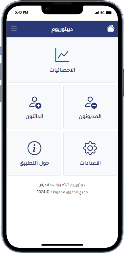 تطبيق إدارة الديون هو أداة مالية تعمل بدون انترنت مصممة لمساعدتك في تتبع وإدارة ديونك بشكل فعال. يحتوي التطبيق على مجموعة من الميزات التي تسهل عملية إدارة الديون وتحسن كفاءتك المالية.